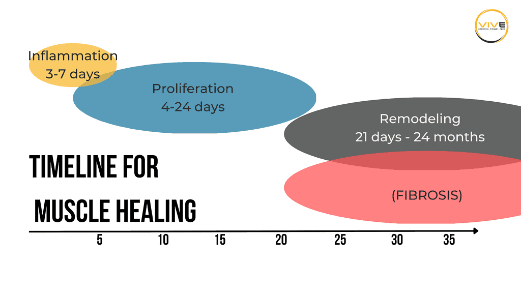 As the muscle fibers continue to heal, they undergo a process called remodeling. This phase starts around day 21, but it can last for up to two years, depending on the injury.