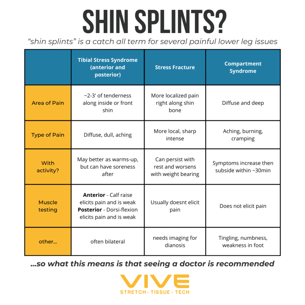 - Anterior Tibial Stress Syndrome, manifests as pain along the front/outer edge of the shinbone (tibia).